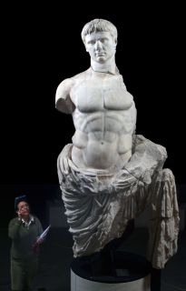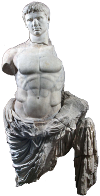 Une statue colossale de l'empereur Auguste présidait autrefois sur le mur du théâtre antique de la ville d'Arles où elle avait été installée vers 12 ou 10 av. J.C. Le torse en marbre réapparu en 1750 puis la tête qui permit d'identifier la représentation d'Auguste debout en semi nudité héroïque. Cette découverte encouragea la poursuite des fouilles et la découverte d'un ensemble de fragments de draperie, mais en calcaire cette fois. L'historien Fernand Benoît formula l'hypothèse selon laquelle la statue était composée du corps en marbre blanc d'Italie enchâssé dans un drapé de calcaire probablement d'origine locale, peint (traces de pourpre) pour rehausser le contraste. Aucune cassure commune, et pour cause, ne pouvait venir étayer cette hypothèse d?une statue composite. Seule une tentative de remontage aurait permis de vérifier stylistiquement la concordance des deux parties. Mais le volume et le poids de l'oeuvre (le torse d'une part et le drapé de l'autre pesant chacun 900kg), et la fragilité du drapé éclaté en une dizaine de fragments interdisait cette expérience hasardeuse