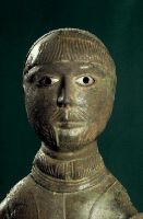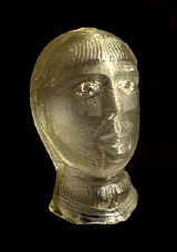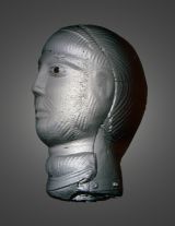 IMAGE 4 - Dans le même temps, au CNRS de Nancy une autre équipe de chercheurs mettait au point un procédé destiné à la matérialisation d’objets conçus en CAO : La stéréophotolithographie. Dans un bac de résine liquide un laser «photopolymérise» couche par couche le modèle numérique sur une grille qui descend pas à pas. Ce procédé unique et totalement innovant à l’époque fut précurseur d’une famille de procédé aujourd’hui répandu sous l’appellation générique de prototypage rapide. Il permit de reproduire la tête du Dieu guerrier gaulois qui fut surmoulée et tirée en plâtre et enfin patinée comme l’original.
