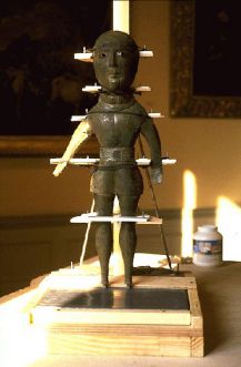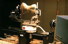 IMAGE 1 - Le Dieu guerrier gaulois de Saint-Maur fut installé sur un prototype de scanner constitué d’une crémaillère animée d’un mouvement pas à pas permettant de faire progresser l’objet devant un faisceau laser plan perpendiculaire afin qu’il en balaie peu à peu toute la surface visible. Une caméra placée à 45° saisissait une image du faisceau laser rouge formé sur l’objet à chaque pas.